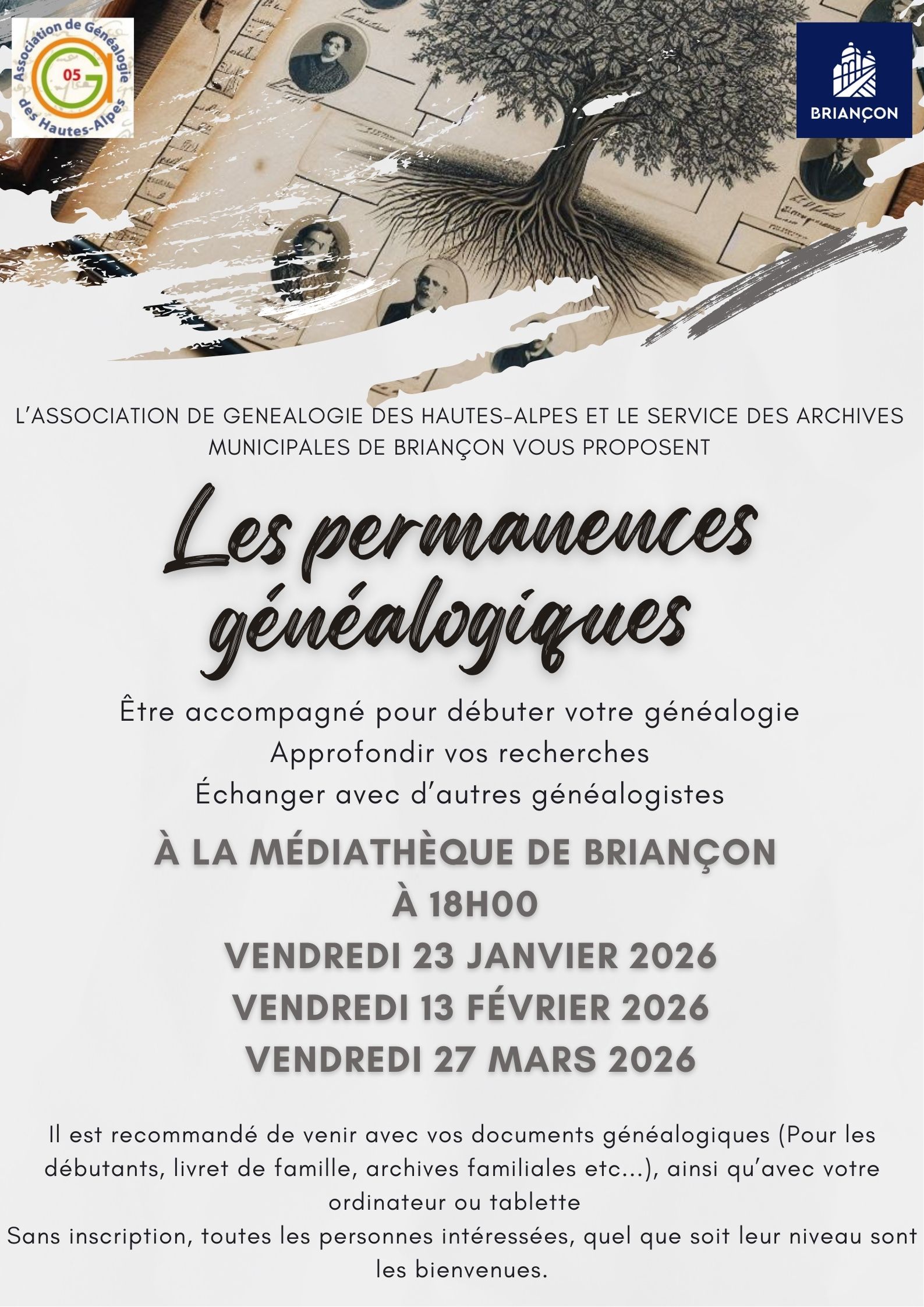 Généalogie à Briançon Article mis en ligne le 9 janvier 2026 par AGHA Les personnes intéressées doivent se présenter à l’heure car la médiathèque ferme ses portes au public à 18h00. Il n’y a pas d’inscription au préalable, toutes les personnes, quel que soit leur niveau sont les bienvenues.